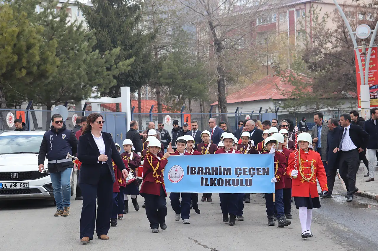 AJANS04 - Ağrı'da 23 Nisan Ulusal Egemenlik ve Çocuk Bayramı coşkusu, Abide Meydanı'ndaki Atatürk Anıtı'na çelenk sunulmasıyla başladı. Tören, saygı duruşu ve İstiklal Marşı'nın okunmasıyla devam etti. Resmi törenin ardından öğrenciler, öğretmenler eşliğinde Kültür ve Kongre Merkezi'ne kadar kortej yürüyüşü gerçekleştirdi.