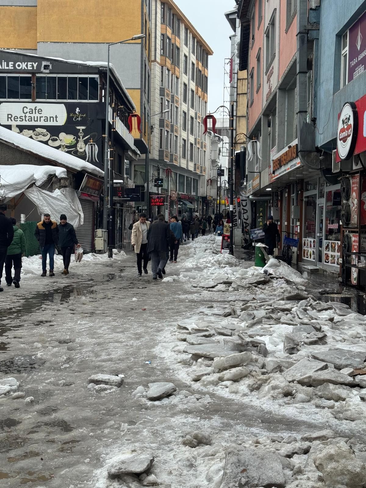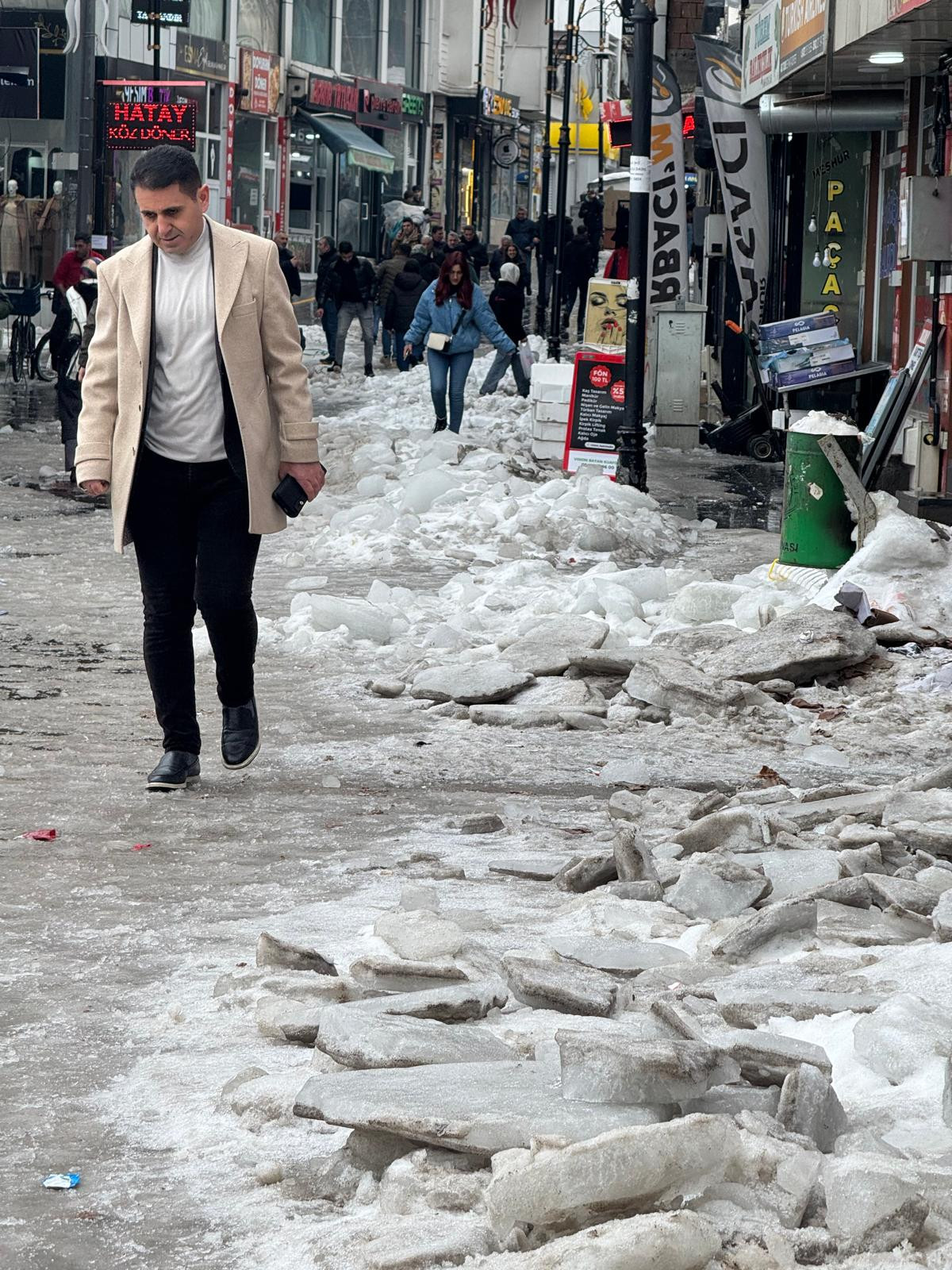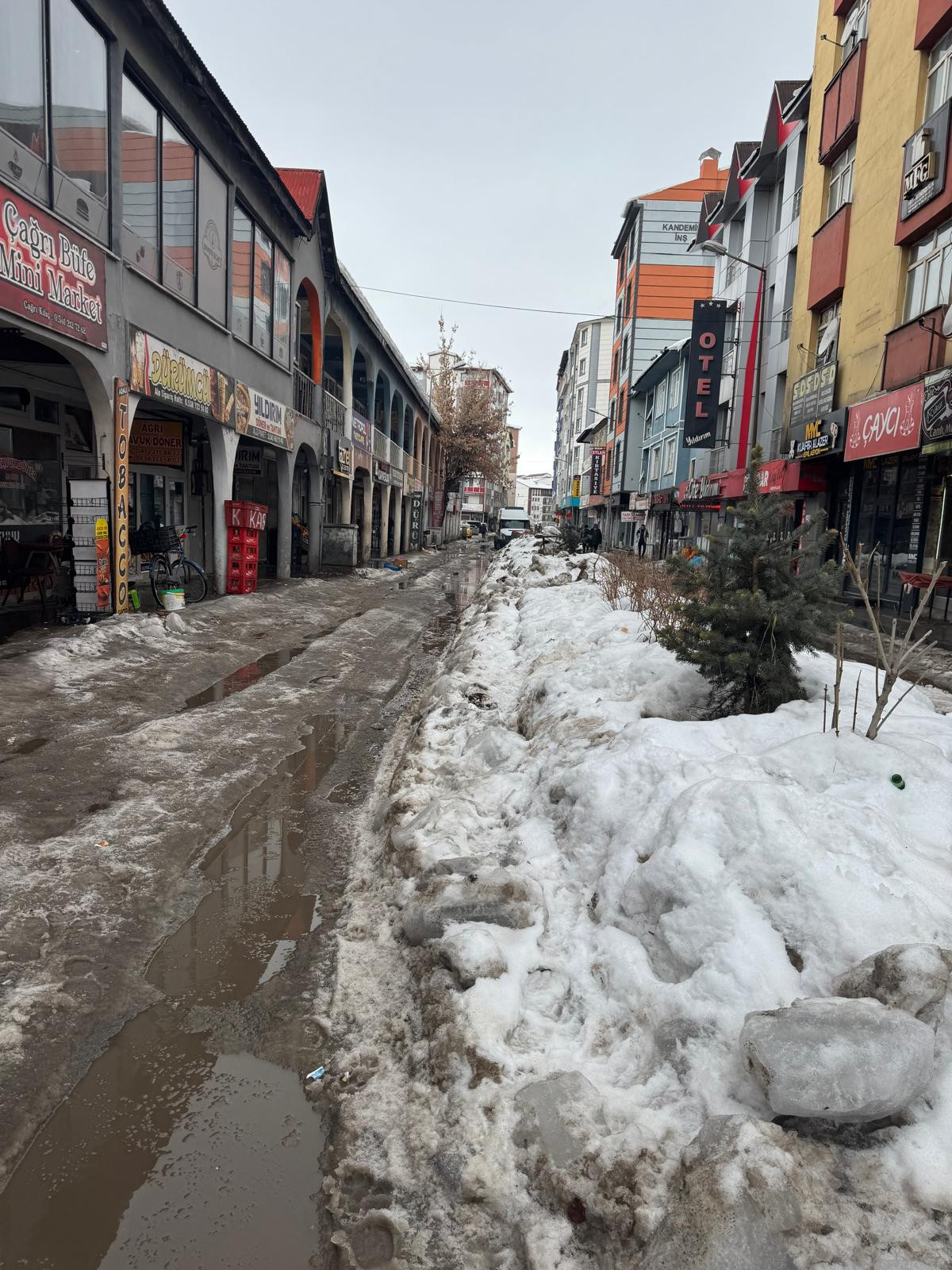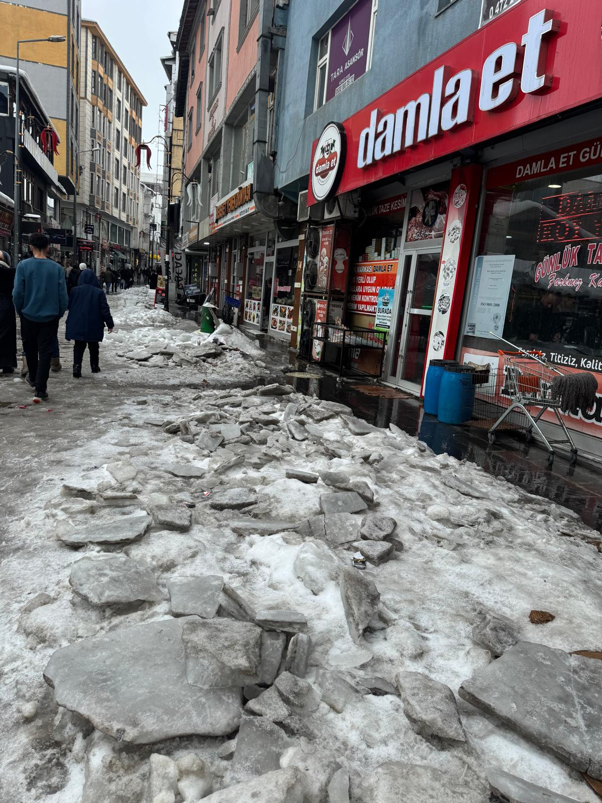 Şehrin birçok noktasında çatılardan sarkan ve temizlenmeyen kar kütleleri, yaya güvenliğini ciddi şekilde tehdit ediyor. Kaldırımlar kullanılamaz halde. İnsanlar ya yolun ortasından yürümek zorunda kalıyor ya da adeta engelli parkurunu andıran bir şehir merkezinde hayatta kalmaya çalışıyor. Bu tablo yalnızca güvenlik sorunu değil; aynı zamanda ticari hayatı da felce uğratan bir durum.
