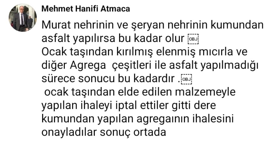 “Murat Nehri’nin ve Şeryan Nehri’nin kumundan asfalt yapılırsa bu kadar olur. Ocak taşından kırılmış, elenmiş mıcırla ve diğer agrega çeşitleriyle asfalt yapılmadığı sürece sonucu bu kadardır. Ocak taşından elde edilen malzemeyle yapılan ihaleyi iptal ettiler, dere kumundan yapılan agreganın ihalesini onayladılar. Sonuç ortada.”