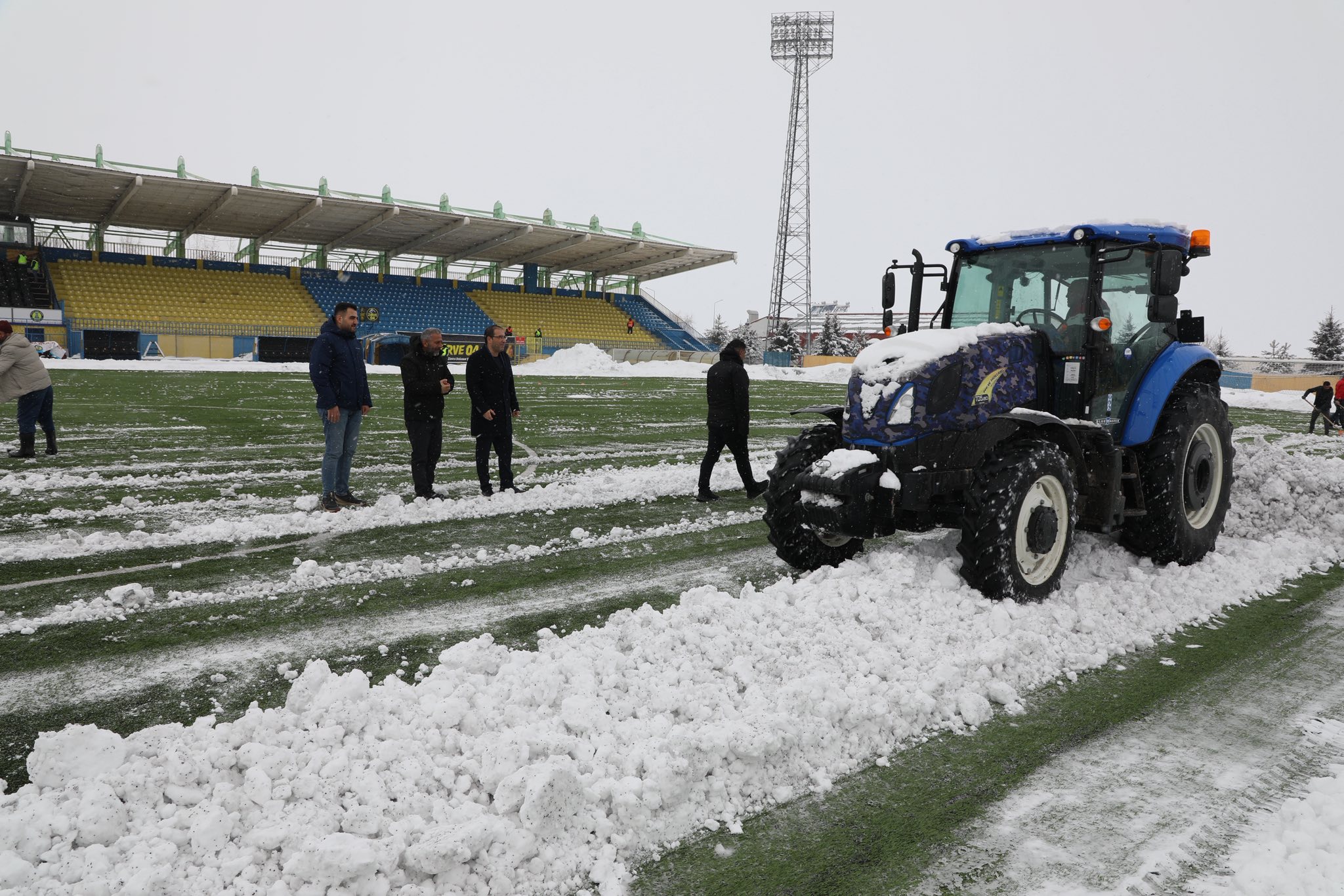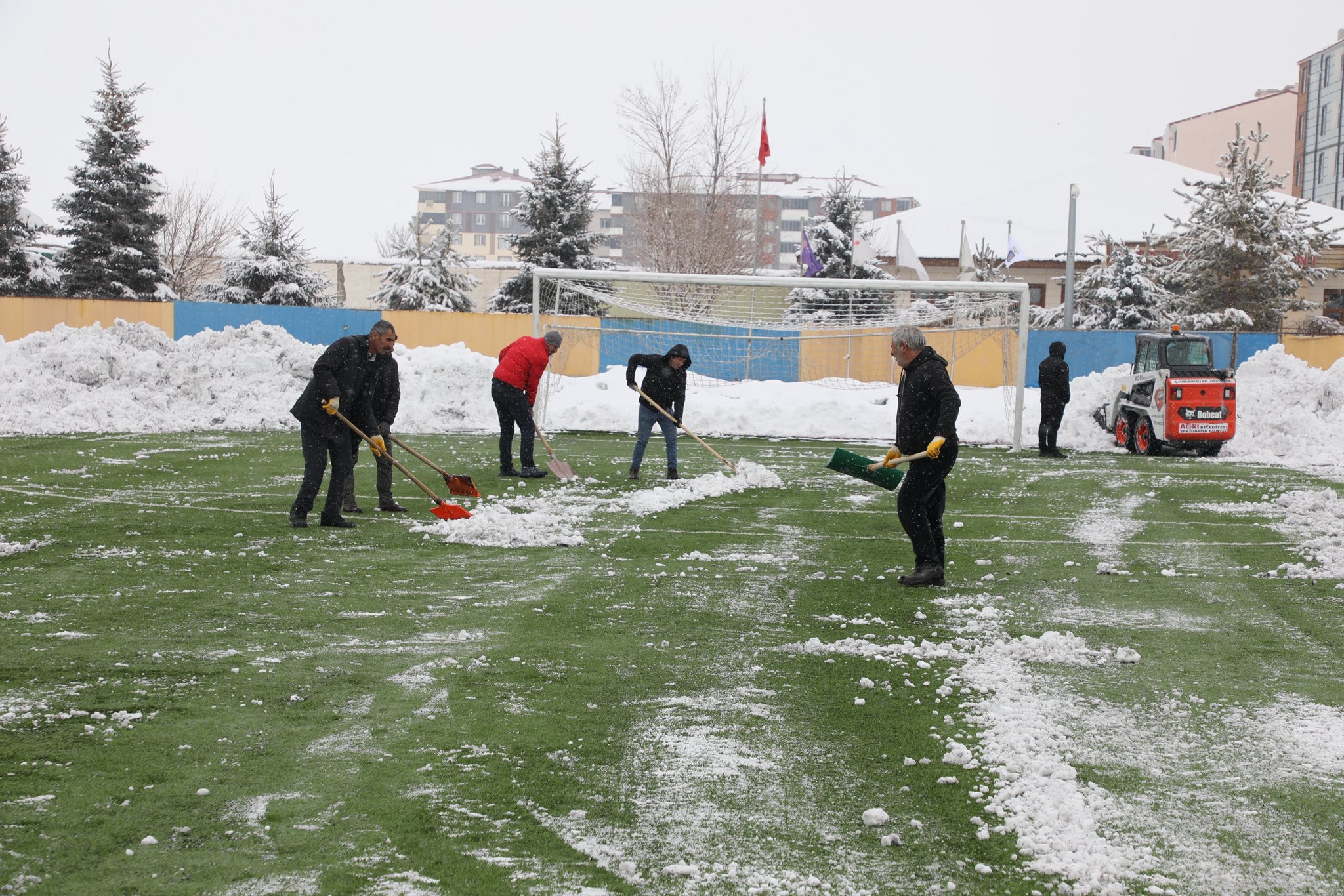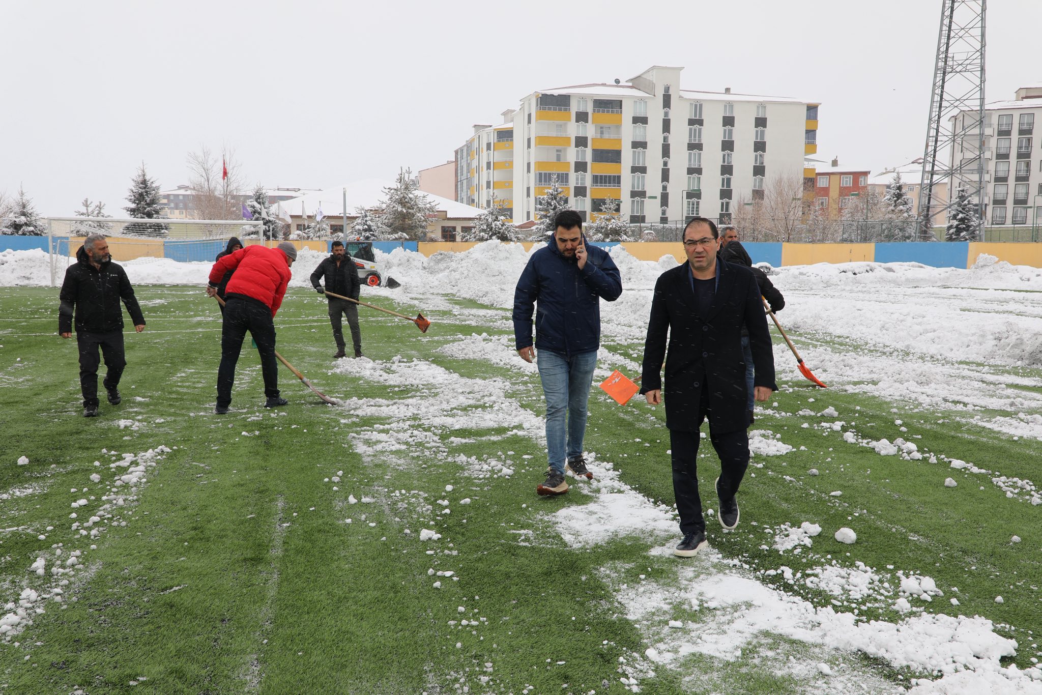O sırada sahada yalnızca yöneticiler değil, Gençlik ve Spor personeli de vardı. Pazar günü olmasına rağmen evlerinden kalkıp gelen personeller, sahanın temizlenmesi için büyük bir özveri gösterdi. Kimi kürekle kar attı, kimi sahayı temizledi, kimi de ekipmanı organize etti.