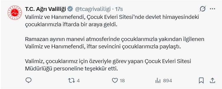 Ancak paylaşımda çocuklara ait herhangi bir görsele yer verilmemesi dikkat çekti. Önceki dönemlerde benzer ziyaretlerde çocukların görüntülerinin kamuoyuyla paylaşıldığı bilinirken, Ağrı Valisi Dr. Önder Bozkurt’un bu tür içeriklerin paylaşılmaması yönünde hassasiyet gösterdiği değerlendirildi.