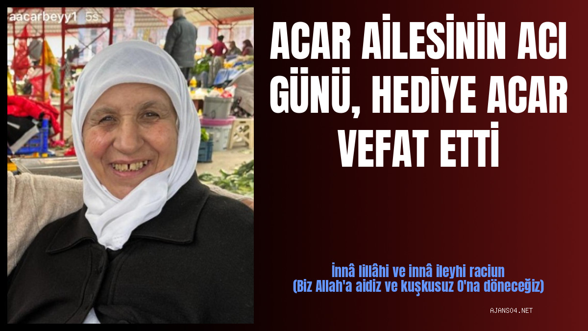 HEDİYE ACAR | 02.11.2025 | ACAR AİLESİ FERTLERİNDEN HEDİYE ACAR HAKKIN RAHMETİNE KAVUŞMUŞTUR.Malhas köyünden rahmetli İsmet Acar'ın eşi, Sami ve Çetin Acar'ın anneleri, Ağrı Konfederasyonu Başkanı Mustafa Acar'ın yengesi Hediye… | Detay göster |